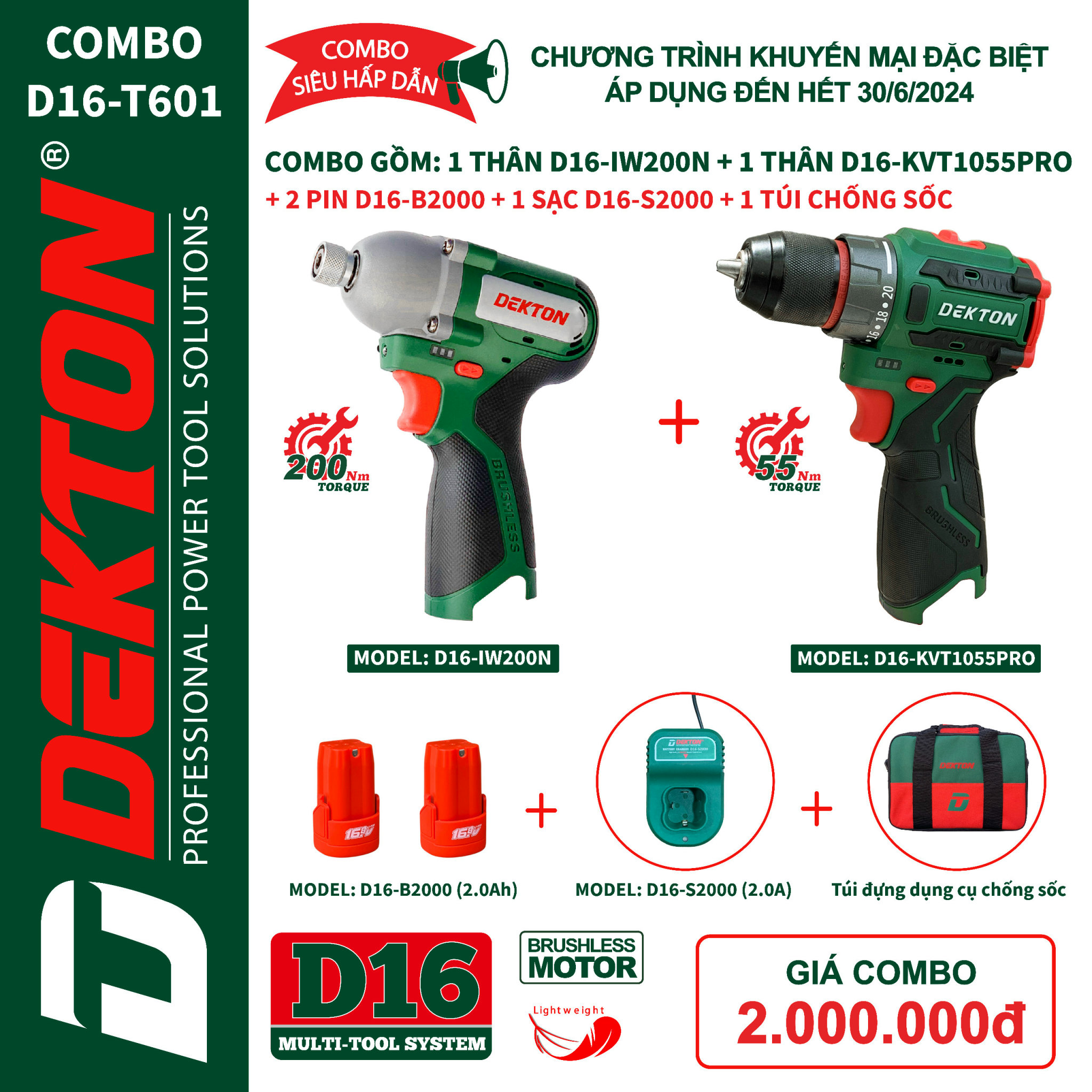Chương trình khuyến mãi đặc biệt của Dekton mang đến cho bạn cơ hội sở hữu combo dụng cụ đa năng D16-IW200N + D16-KVT1055PRO với giá ưu đãi chỉ 2.000.000 đồng.
