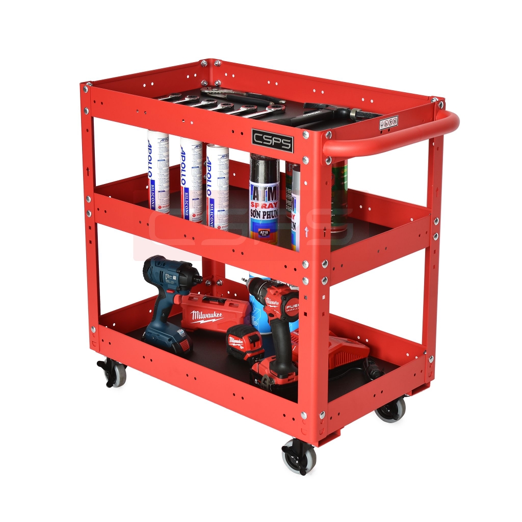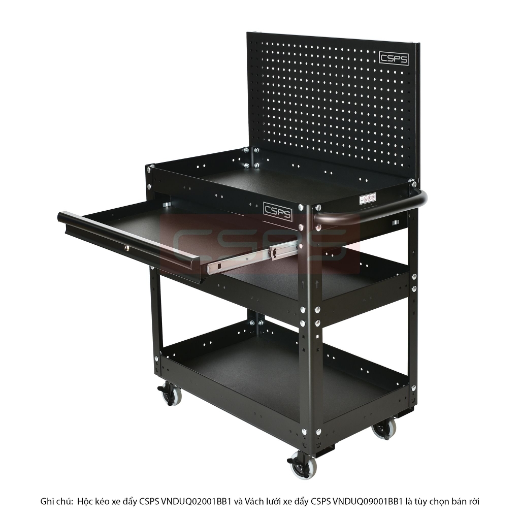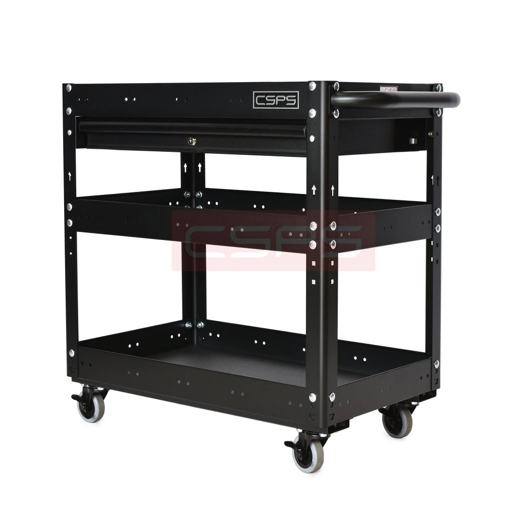 Xe đẩy 3 tầng có hộc kéo và vách lưới, giúp bạn sắp xếp khu vực làm việc hiệu quả, là một trang bị cần thiết cho nhà máy, garage, cửa hàng hay văn phòng làm việc Trolley 3 levels with drawers and mesh walls black which is suitable for workshop, factory, garage, shop, office… will help you organize working area efficiently.