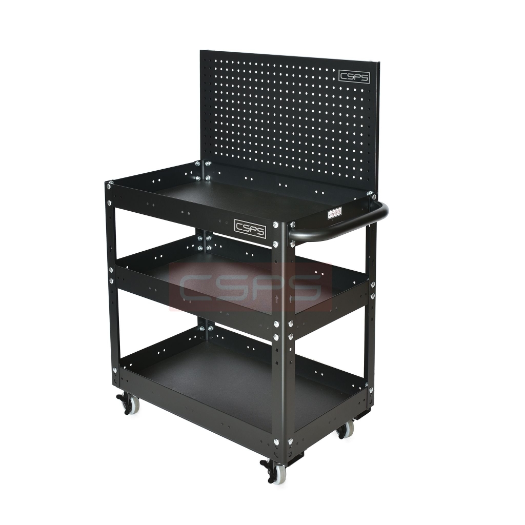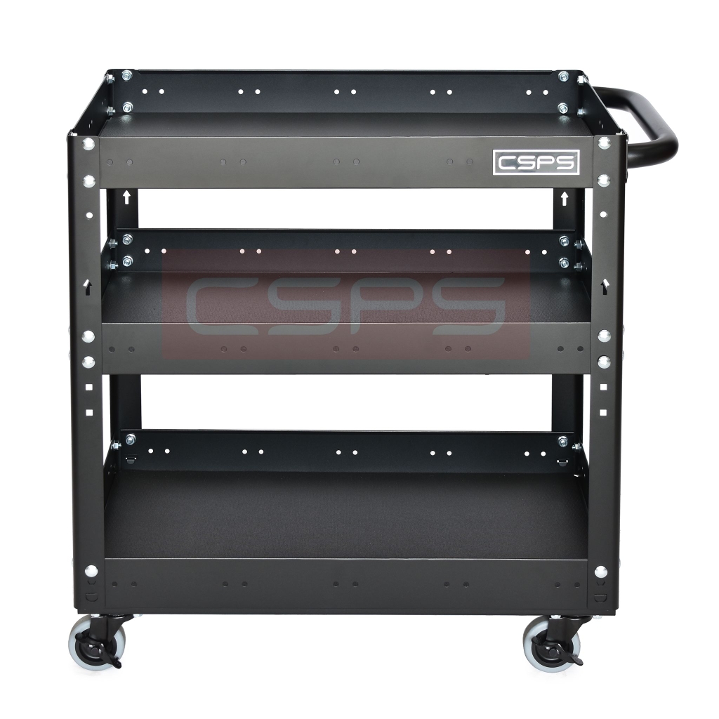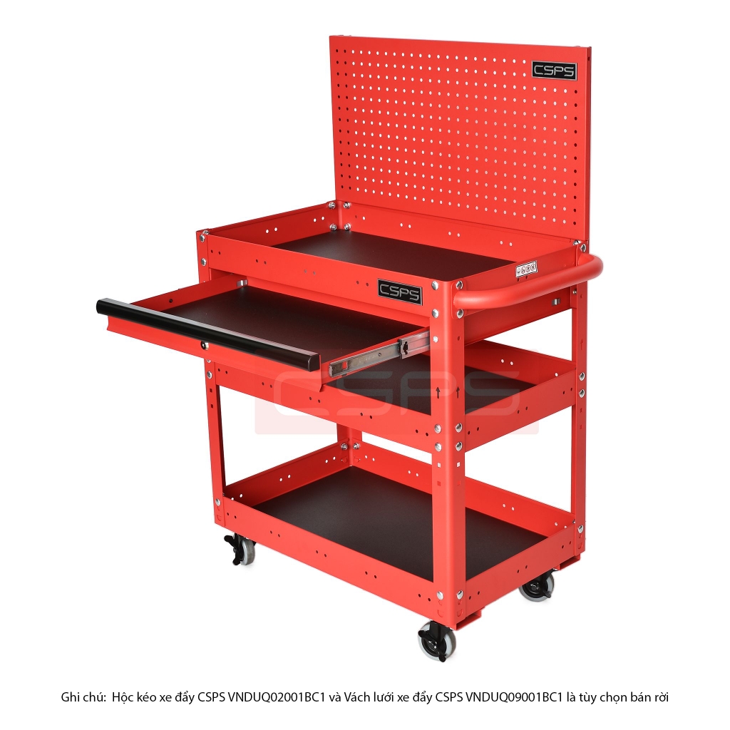 Xe đẩy 3 tầng có hộc kéo và vách lưới, giúp bạn sắp xếp khu vực làm việc hiệu quả, là một trang bị cần thiết cho nhà máy, garage, cửa hàng hay văn phòng làm việc Trolley 3 levels with drawers and mesh walls black which is suitable for workshop, factory, garage, shop, office… will help you organize working area efficiently.